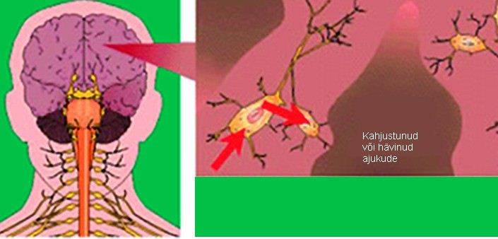 Alzheimeri tõve korral ajukude piirkonniti kahjustub või hävib, virgatsainete süntees aeglustub ning impulsid ei kandu edasi.