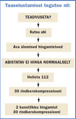 – kui abiandja ei ole suuteline või ei soovi teha suust suhu hingamist, võib rakendada ainult rindkerekompressioone sagedusega 100 korda minutis;